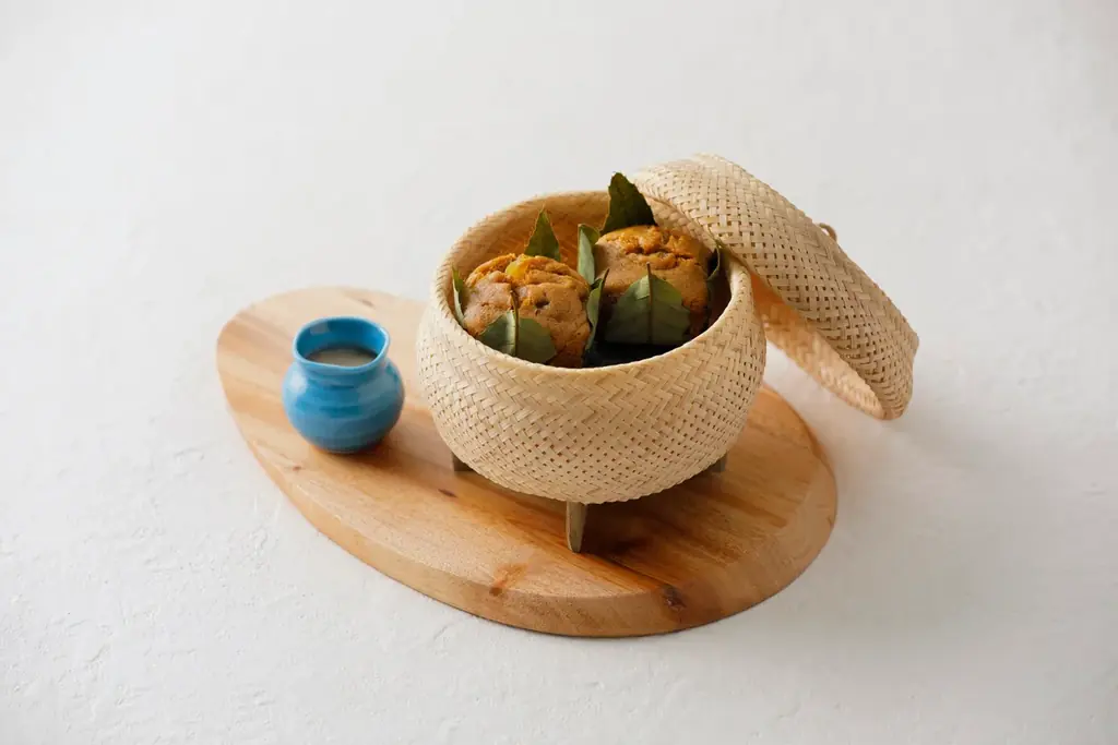 カンボジアの伝統的な蒸しケーキに着想を得たWAGURIノム・アーカオは、ココナッツミルクの香りを生かした生地で和栗あんを包み、栗の葉で巻いて仕上げた。蒸し菓子の素朴さと和栗の甘さが調和する構成である。