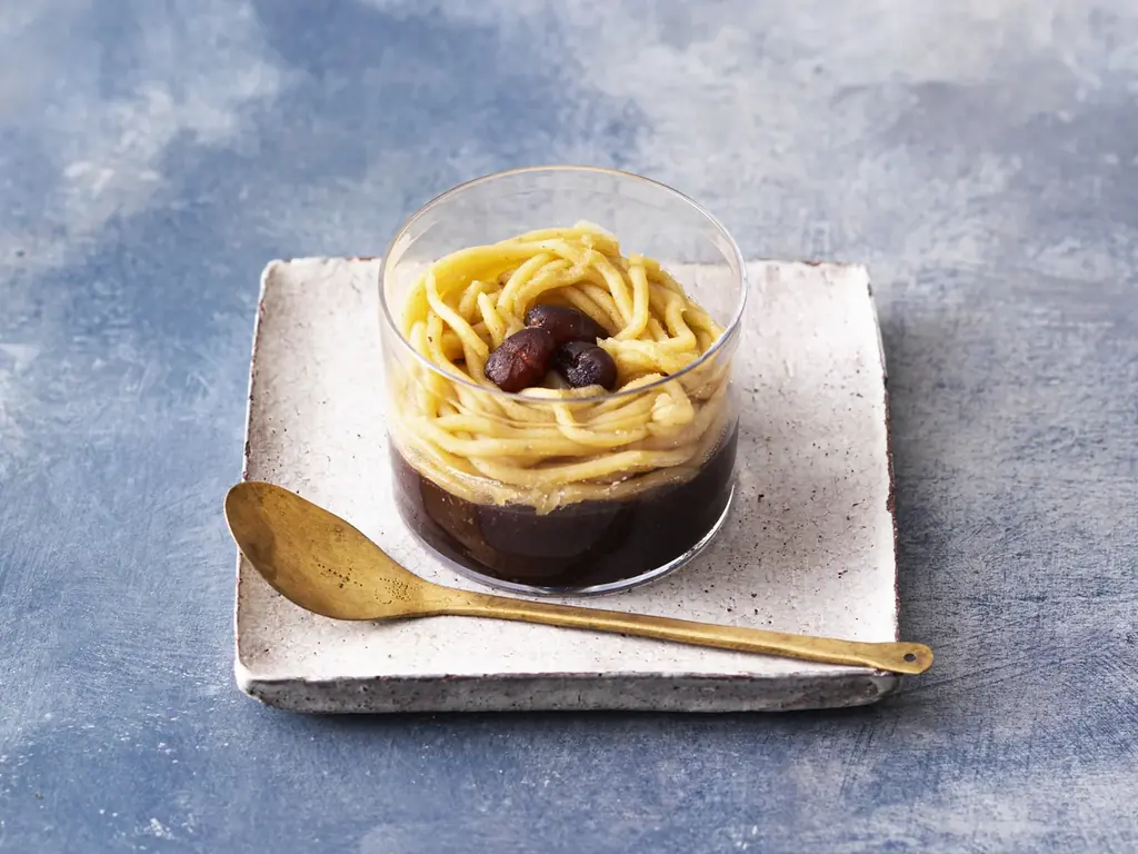 - 和栗のモンブラン(和風):1個 453円/銀座甘楽(グランスタ東京/改札内B1 銀の鈴エリア)。ようかんと栗ペーストの組合せによる和風モンブラン(カップ入り)。