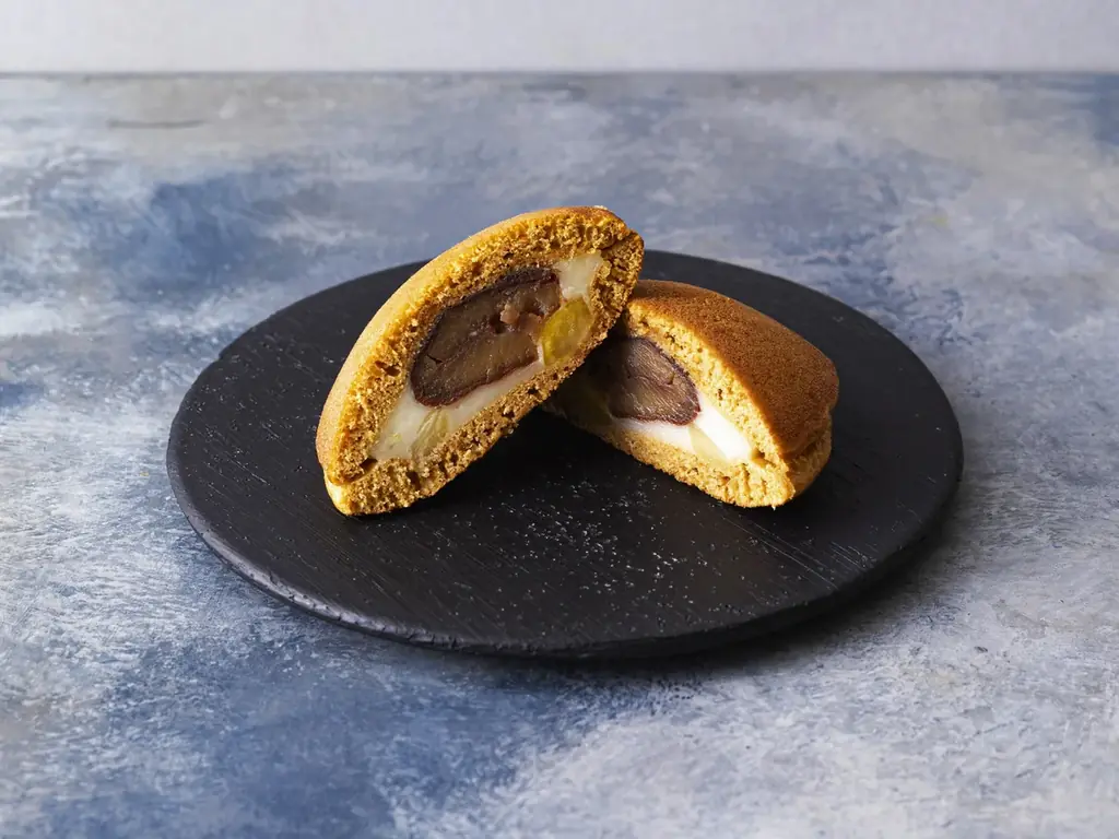 - ごろごろまるごと渋皮栗のミルクどらやき:1個 330円/香炉庵 KOURO-AN(グランスタ東京/改札内B1 銀の鈴エリア)。黒糖どらやき生地に渋皮栗丸ごと1個と刻み栗をサンド、北海道産ミルククリーム添え。