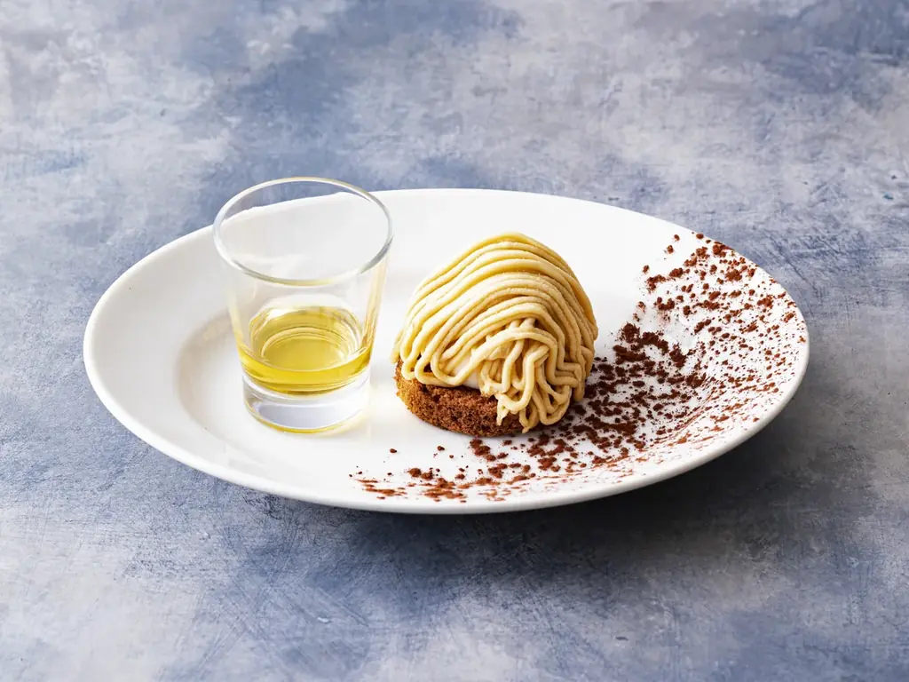 - 和栗を使ったサバラン風モンブラン(イートイン限定):1皿 1,380円/Japanese Malt Whisky SAKURA(グランスタ東京/改札内B1 スクエア ゼロエリア)。モンブランにウイスキー(ニッカウヰスキー「シングルモルト 宮城峡」)を染み込ませる新感覚の提供。数量限定1日6食、20歳未満の飲酒は不可。