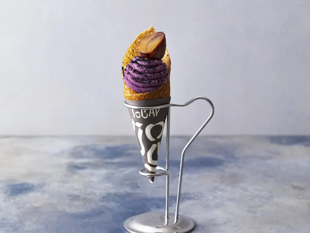 - 栗と紫いものモンブラン:1個 550円/SOBAP(ソバープ)(グランスタ東京/改札内1F 吹き抜けエリア)。そば粉のミニクレープ、紫いもクリームと栗の渋皮煮をトッピング。