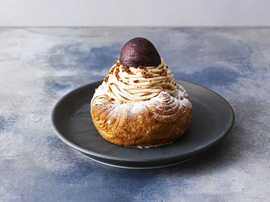 - 栗とショコラのデニッシュ:1個 587円(テイクアウト)/598円(イートイン)/THE STANDARD BAKERS TOKYO(グランスタ東京/改札内1F 中央通路エリア)。北海道産小麦とバターのデニッシュにマスカルポーネとチョコクリーム、和栗のモンブランクリームを重ね、渋皮栗とオレンジピールをトッピング。数量限定で1日30個。