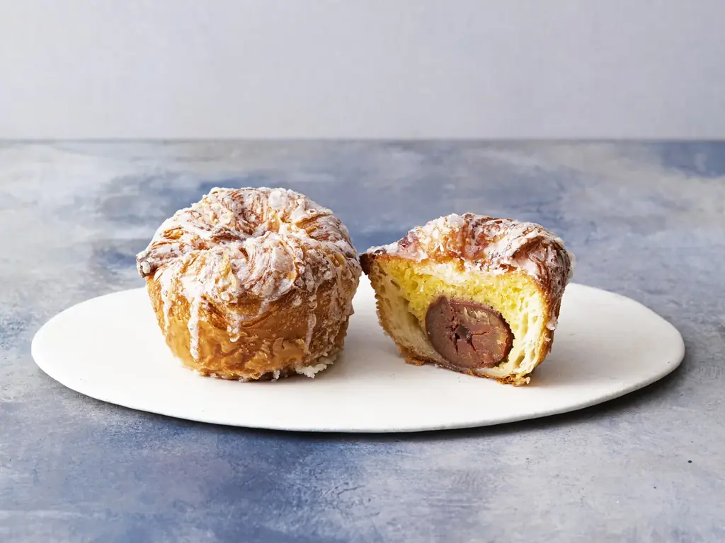 - マロンパイ:1個 398円(テイクアウト)/405円(イートイン)/Curly’s Croissant TOKYO BAKE STAND(グランスタ東京/改札内B1 スクエア ゼロエリア)。大粒の和栗1個とアーモンドクリーム、ラム酒香る生地。数量限定で1日30個。