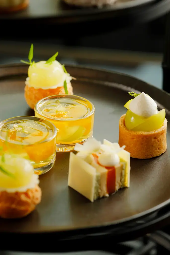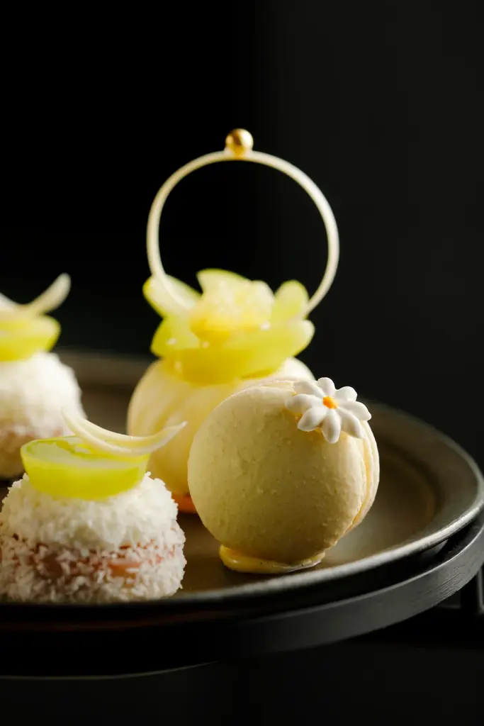- 上段:ライチのムース 丸の内ハニーのレモンマーマレード、ミントのマカロン、ココナッツフィナンシェ シャインマスカット