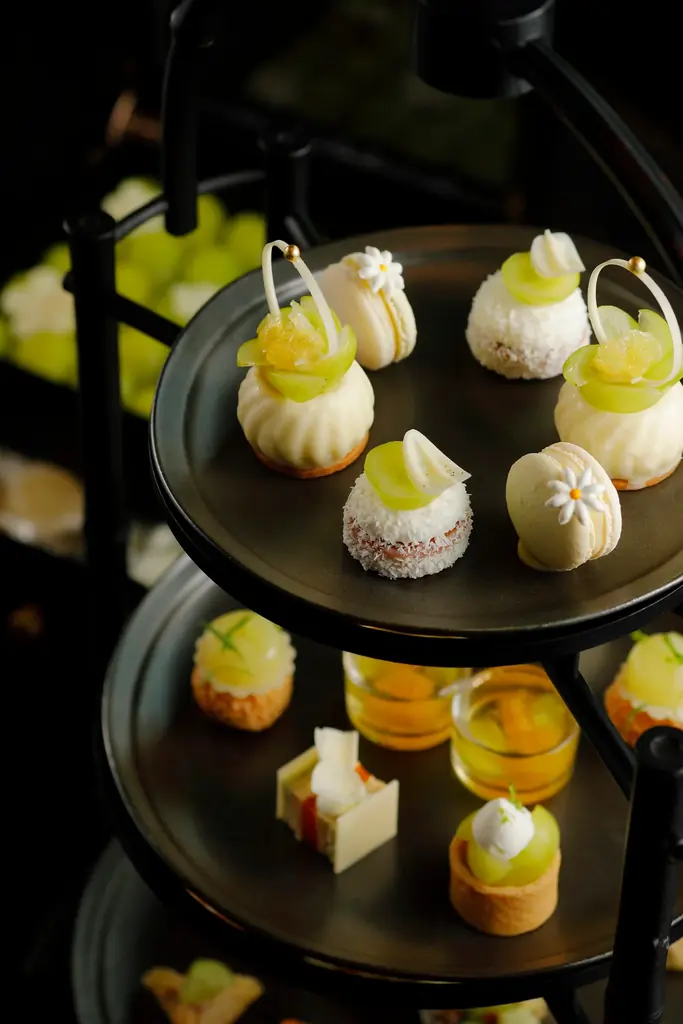 - 中段:マスカットのシュークリーム(青りんごとエルダーフラワーのジュレ)、マスカットティーとアプリコットのケーキ、シャインマスカットのタルト、カモミールとレモングラスのジュレ