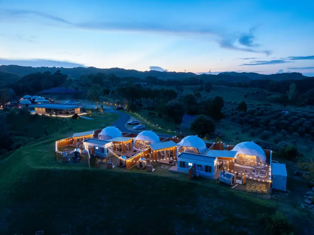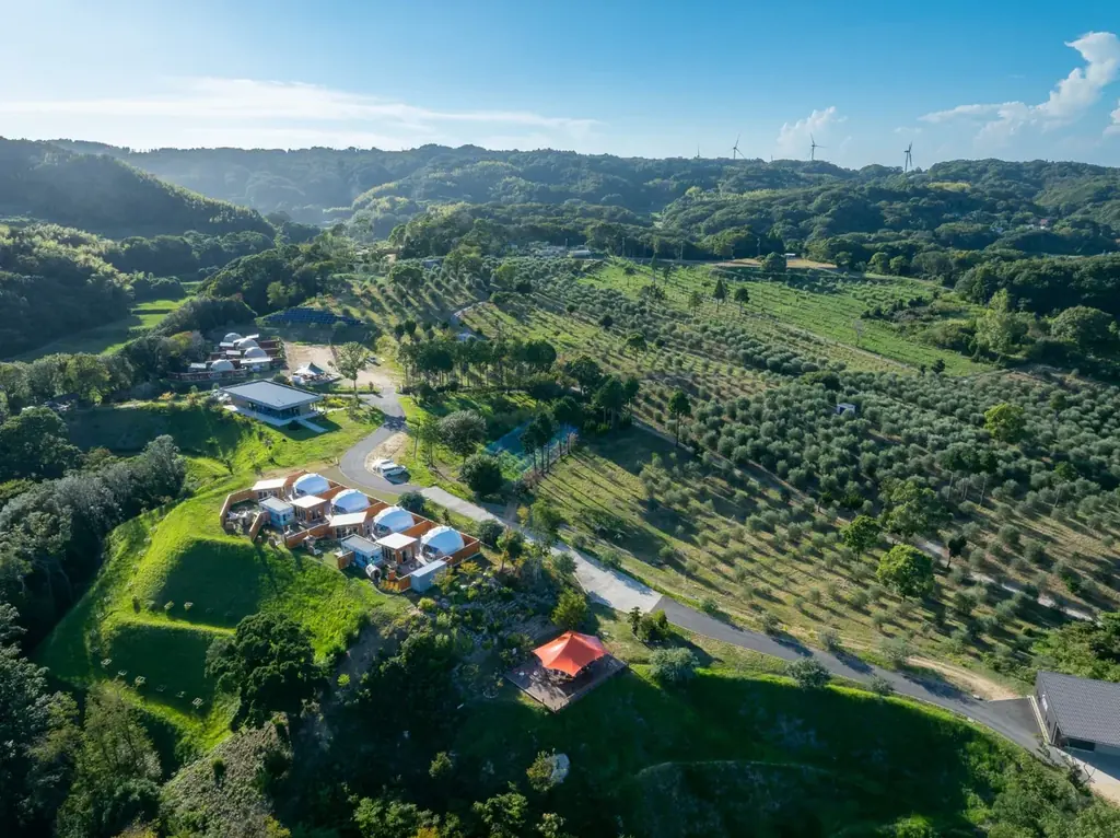Olive Glamp淡路島 Virgin Valleyは淡路島北部、高台の敷地に位置し、全8棟のグランピングユニットを有します。全室冷暖房完備で、季節を問わず快適に過ごせる点が謳われています。