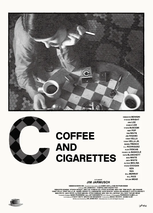 『コーヒー&シガレッツ』はコーヒーを囲みタバコを吸いながら繰り広げられる11のエピソードからなるオムニバス形式の作品で、ジム・ジャームッシュ監督らしいユーモアと独特の空気感が特徴である。出演陣にはロベルト・ベニーニ、スティーヴン・ライト、ジョイ・リー、スティーヴ・ブシェミ、トム・ウェイツ、イギー・ポップ、ケイト・ブランシェットのほか、The White Stripesのメグ・ホワイトとジャック・ホワイト、Wu-Tang ClanのRZAやGZAといったミュージシャン、コメディアンらが名を連ねる。