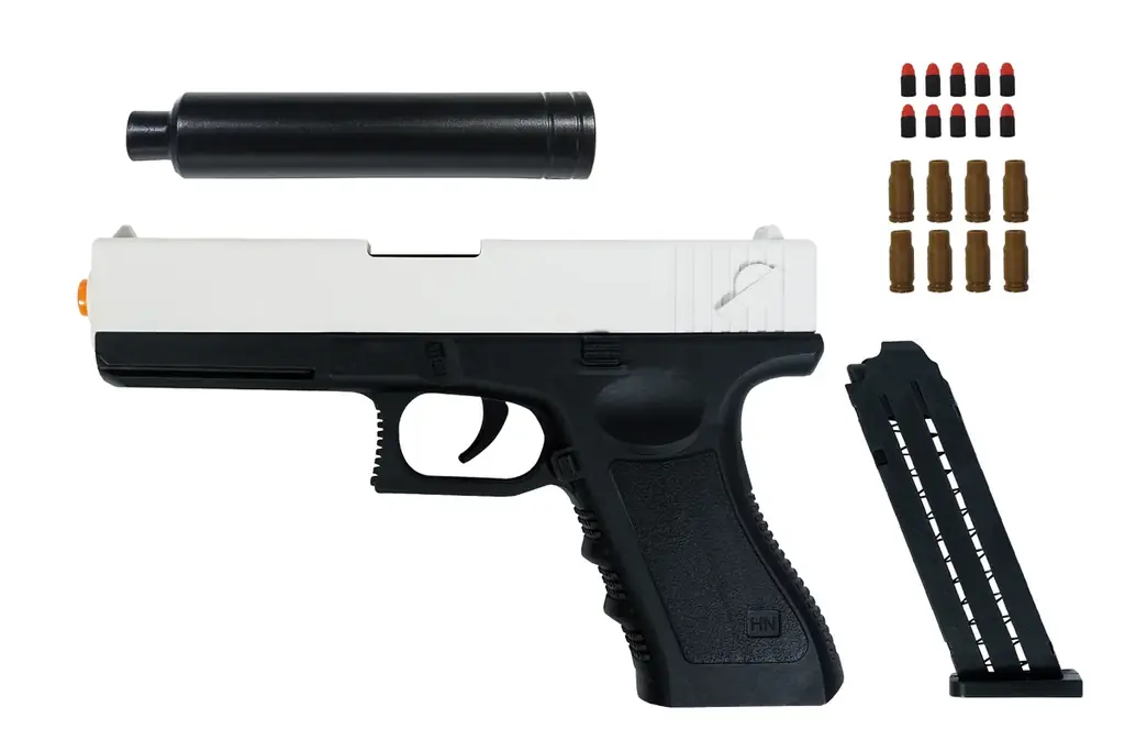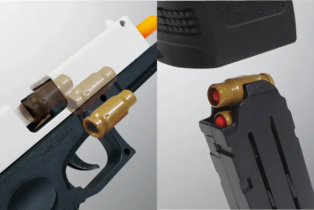 ブローバックエアーガンは、射撃後にスライド操作を行うと薬莢が飛ぶギミックを搭載したエアーガン玩具です。製品は銃栓を後方に引き、トリガーを引くだけで発射できる操作性を備えています。付属のサプレッサー(消音器風パーツ)により外観上の雰囲気が高められています。