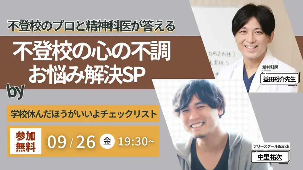 2025年9月26日(金)19:30〜20:30に、児童精神科医・益田裕介先生を迎えた無料のオンライン講演会「不登校のプロと精神科医益田先生が答える、不登校のお悩み解決スペシャル」が実施されます。主催は「学校休んだほうがいいよチェックリスト」を運営する3団体で、YouTube Liveで配信されます。