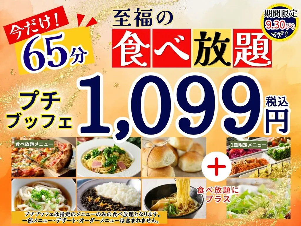 本キャンペーンは「よりリーズナブルに、よりカジュアルに」食べ放題を楽しみたい層を主な対象とした企画で、もともとランチ利用に人気の高いプチブッフェを短時間で満足できる内容に拡充しています。税抜価格と税込価格の表記を併記し、会計時の混同を避ける配慮も明示されています。