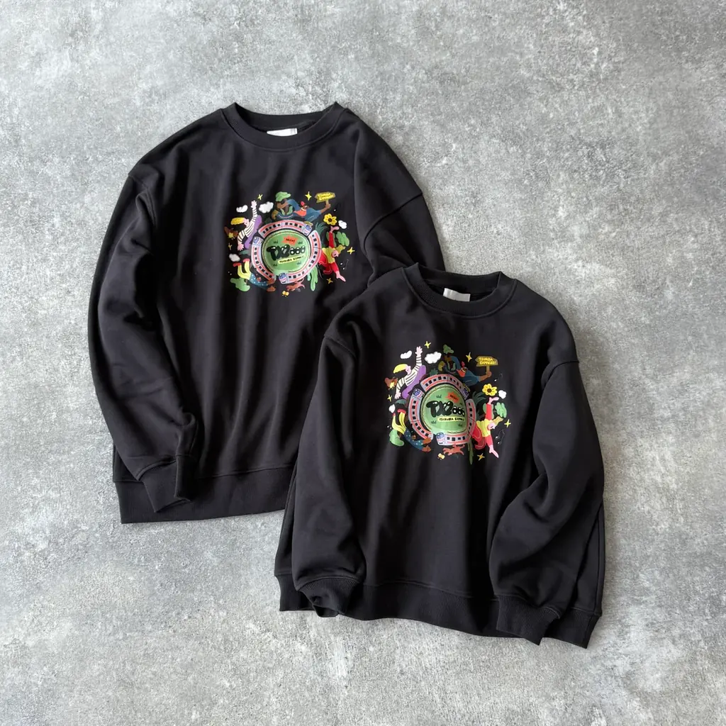 カラー・サイズ例 | ロンT:オフ・チャコールグレー・ピンク/サイズFREE、トート:アイボリー・ピンク・ブラウン/FREE | スウェット:オフ・トップグレー・スミクロ(レディース/FREE、キッズ/130cm)、チャーム:イエロー・グリーン・ブルー |