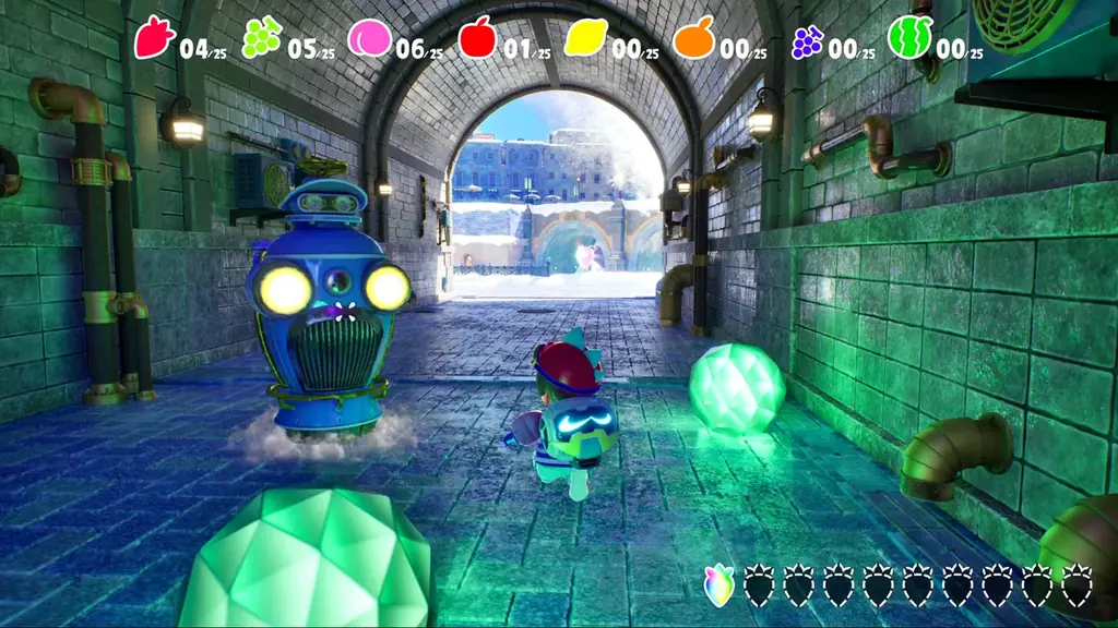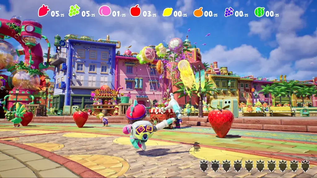 - 集めたフルーツをゴールへ運ぶ:ステージのゴールにフルーツを持っていくことでクリアとなる。1つ持っていればゴール扱いになる仕様が、プレイスタイルの自由度を高めている。