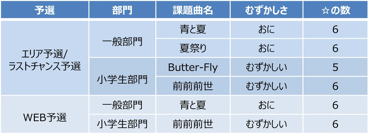 エリア予選およびラストチャンス予選は、部門ごとに課題曲が2曲指定されます。各課題曲はそれぞれ2回ずつプレイし、合計4回のプレイを行います。各曲ごとのベストスコアのみを採用し、2曲のベストスコア合計で順位を決定します。