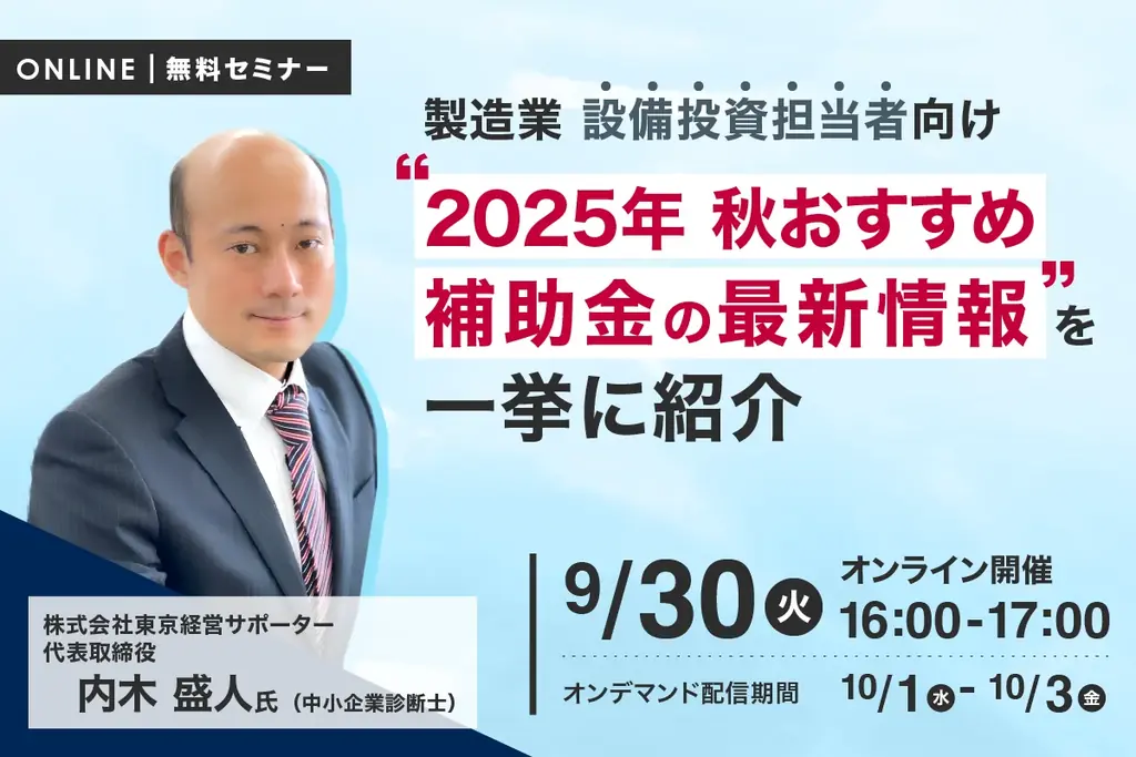 セミナー名 | 製造業設備投資担当者向け 2025年秋おすすめ補助金の最新情報を一挙に紹介 |
