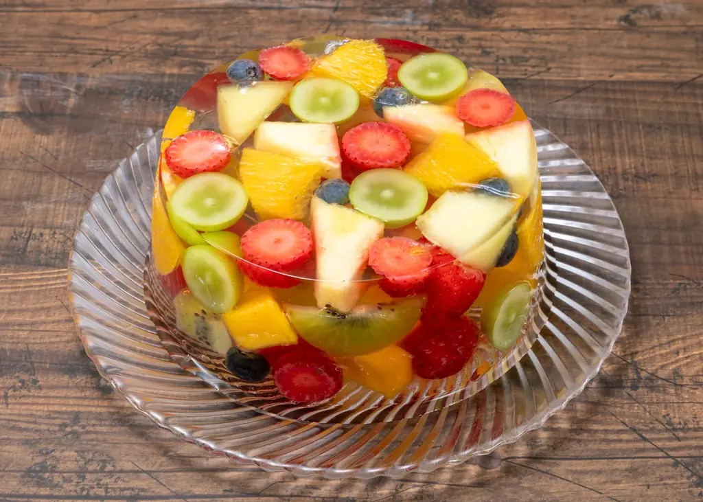 テイクアウト税込5,184円。8種類のフルーツをたっぷり詰め込んだクリスマス限定のゼリー商品です。乳製品アレルギーの方やケーキよりゼリーを好む方にも向けられており、ゼリーは固めに仕上げられているため型から取り出して切り分けることが可能です。はちみつ使用。