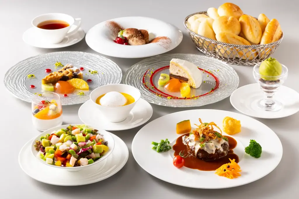 - 内容:チョップドサラダボール、かぼちゃのカプチーノ、黒毛和牛ハンブルグステーキ、パン(食べ放題)、選べるスイーツ(5種)、珈琲 or 紅茶