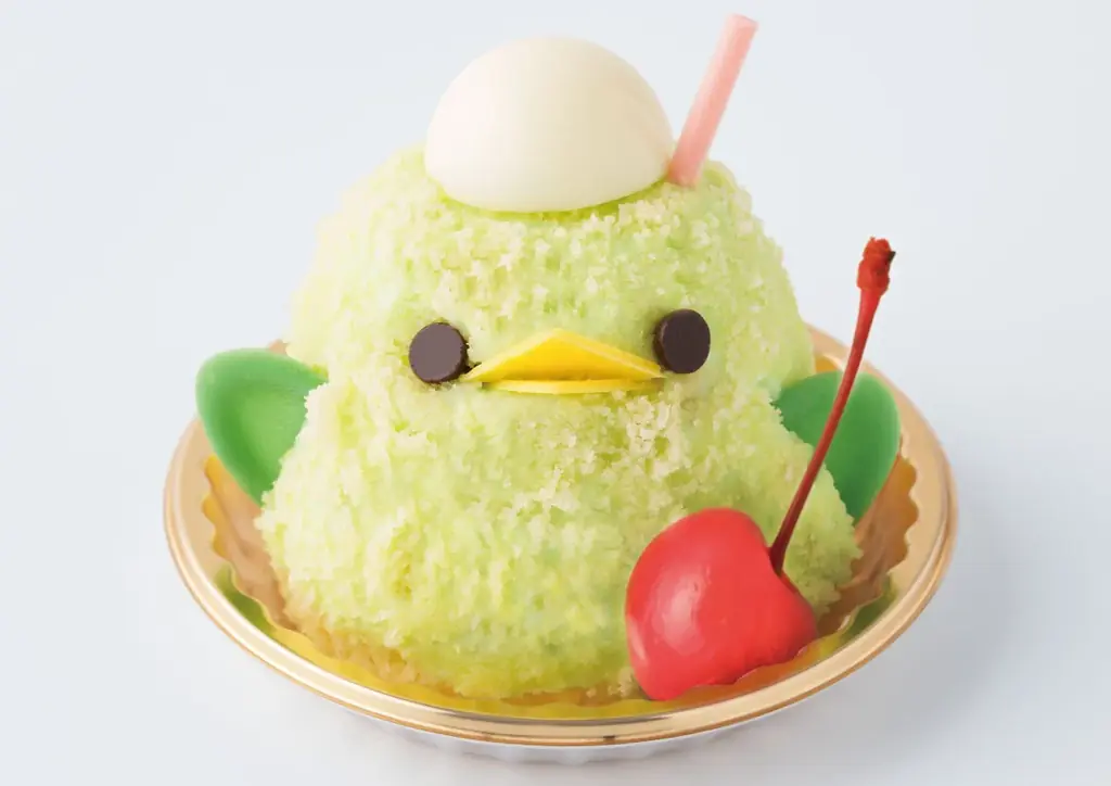 「メロンソーダぴよりん」は、名古屋コーチン卵を使った濃厚なプリンをメロン味のババロアで包み、ポッピングキャンディでシュワシュワ感を再現しています。体色は鮮やかなメロンソーダカラーのふわふわボディで、頭にはアイスを模したチョコ、胸元には真っ赤なチェリー、ピンク色のチョコでストローを表現した見た目にも楽しい仕上がりです。