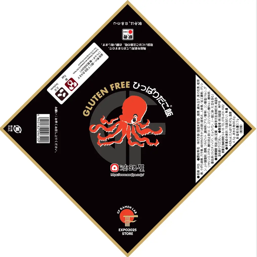器は蛸壺型のままですが、淡路屋として初めて採用した黒マット調を施し、GF RAMEN LABのコンセプトや店舗イメージから着想を得たシックなデザインとしています。掛け紙には大きく蛸を描き、視認性を高めるために「GF」や「グルテンフリー」の表記を加えています。