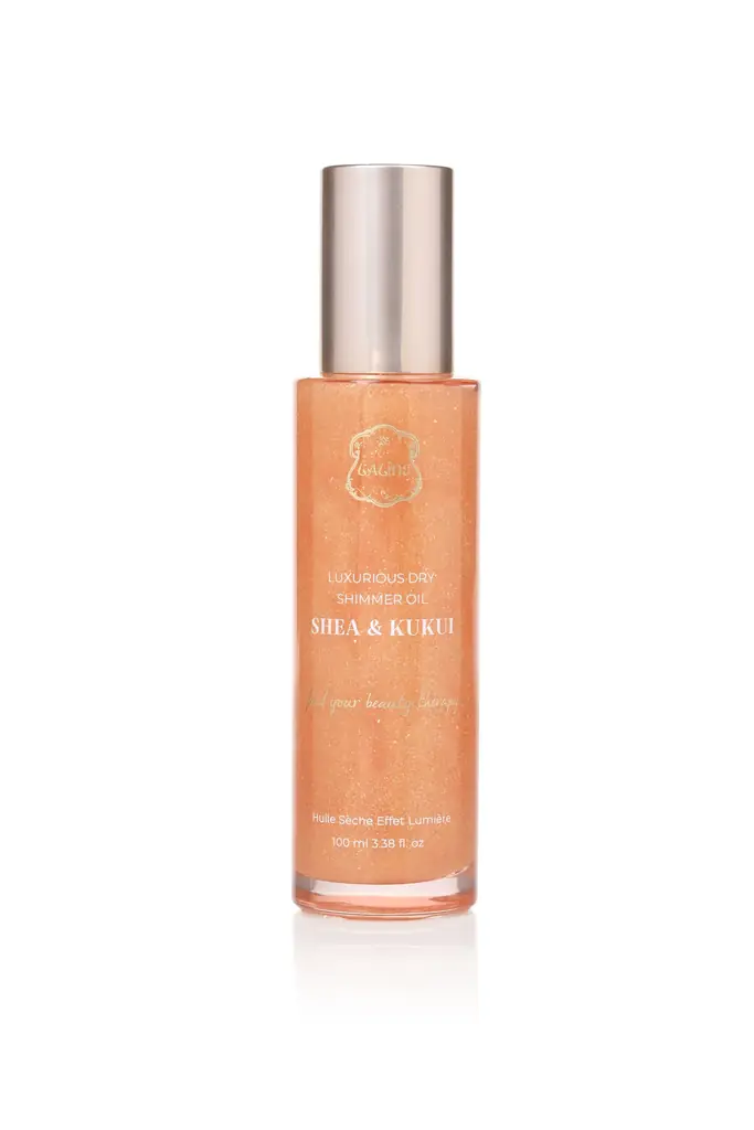 繊細なグリッターを配合したドライボディオイル。マカダミアナッツオイル、シアバター、ククイナッツオイル、ビタミンEを含み、光を受けるたびに肌を艶めかせます。