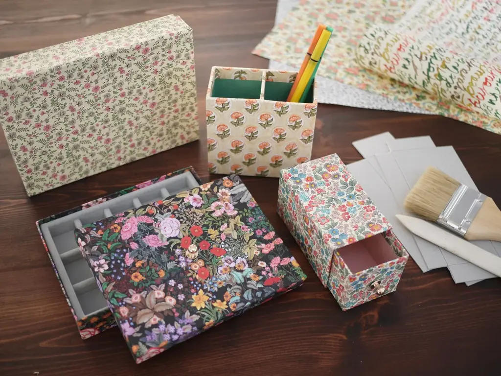 - 海外デザインペーパー(イタリア、アメリカ等)から柄を選び箱を作るワークショップ。各回約90分。