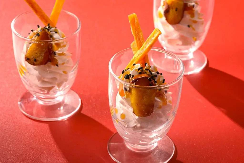 もう一つの新メニューは「千葉県産金蜜芋のミニパフェ」です。ねっとりとした上品な甘さの金蜜芋とソフトクリームの組み合わせが特徴で、スイーツの合間のお口直しにも適しています。