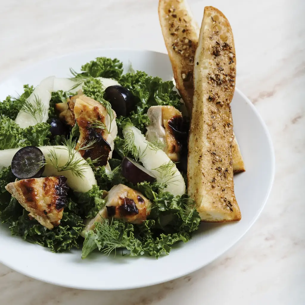 - ハニーマスタードチキンと洋梨、巨峰のケールサラダ(ベルガモットドレッシング)