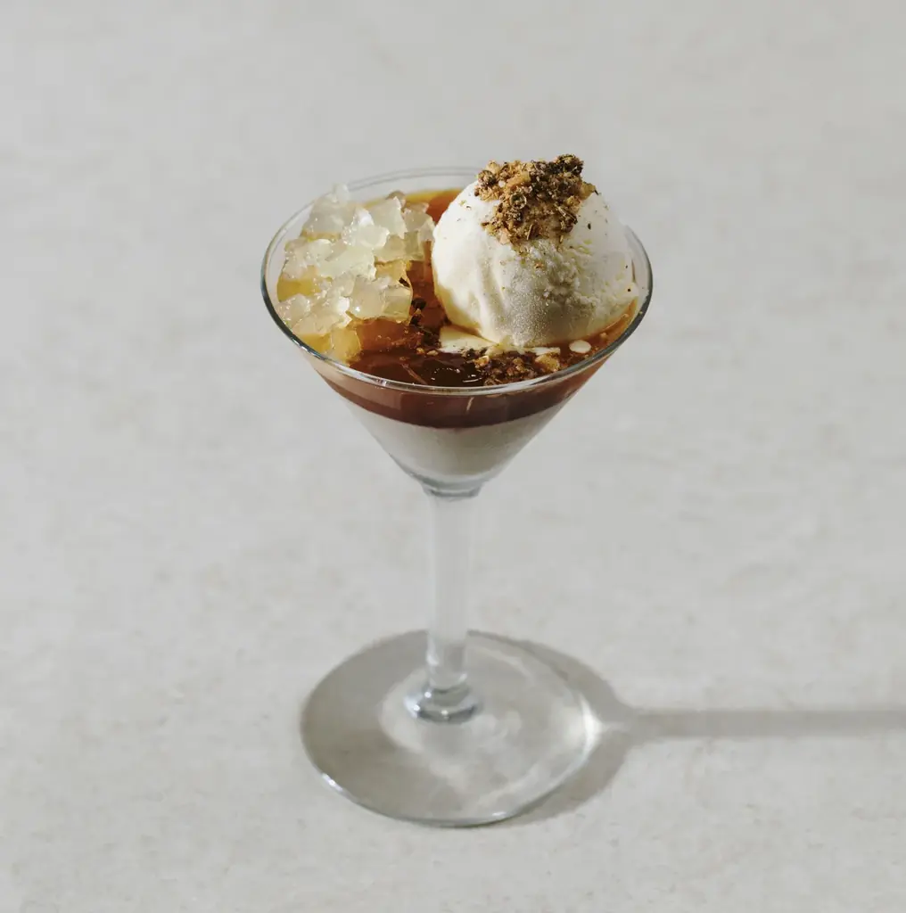 - ほうじ茶ババロアと紅茶のジュレ、ベルガモットとデュカのミニパフェ