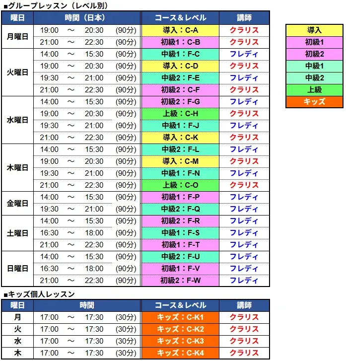 スケジュールは先着順のクラス割当となり、希望とレベルにより曜日を選択できます。