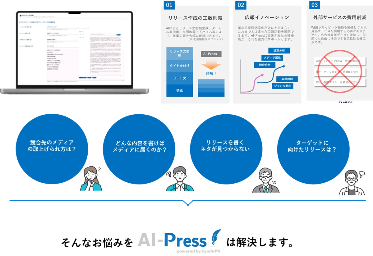 『AI-Press』は広報・PR業務に特化したSaaS型のAIツールで、リリース初稿の自動作成をはじめ、業界論調分析やWEBクリッピングなど複数の機能を組み合わせて情報発信の質と効率を高めることを目的としています。
