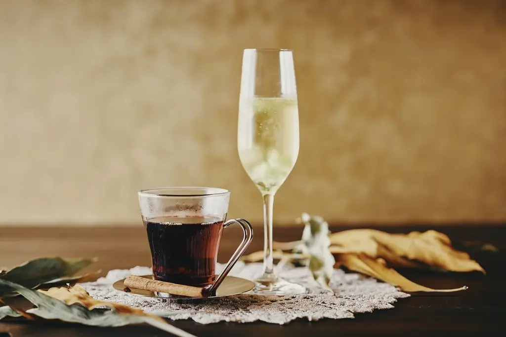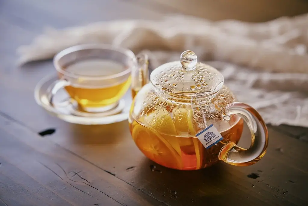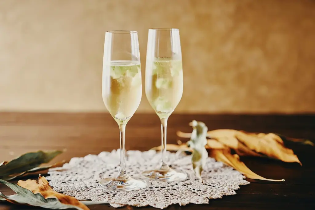 - 果実のブレンドハーブティー(グレープフルーツ、国産レモンブレンド)¥1,230、シャインマスカット入りスパークリングワイン ¥1,230。