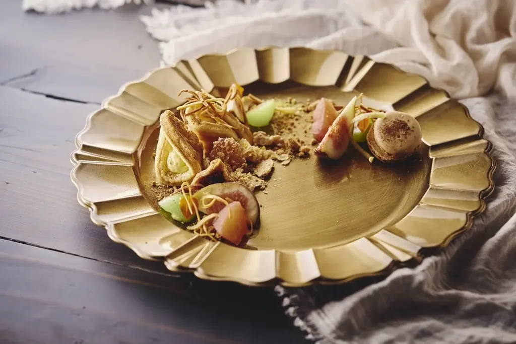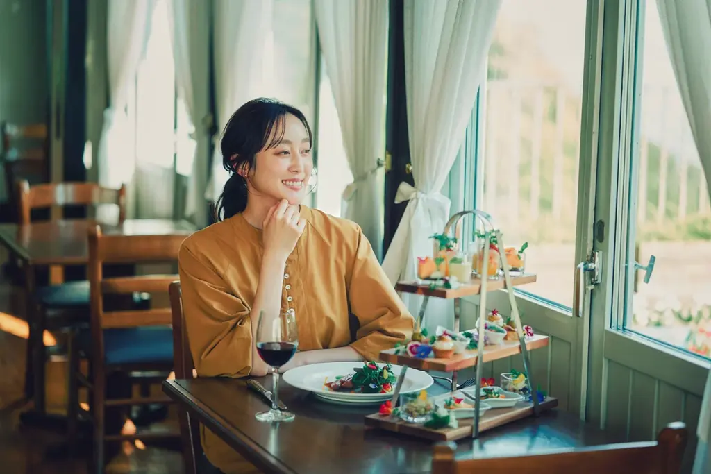 前菜からメイン、デザートまで、隣接するガーデンで収穫されたフレッシュなエディブルフラワーやハーブをふんだんに使用したメニューが特徴です。提供されるランチは前菜スタンドや選べるメインが組み合わされる構成です。