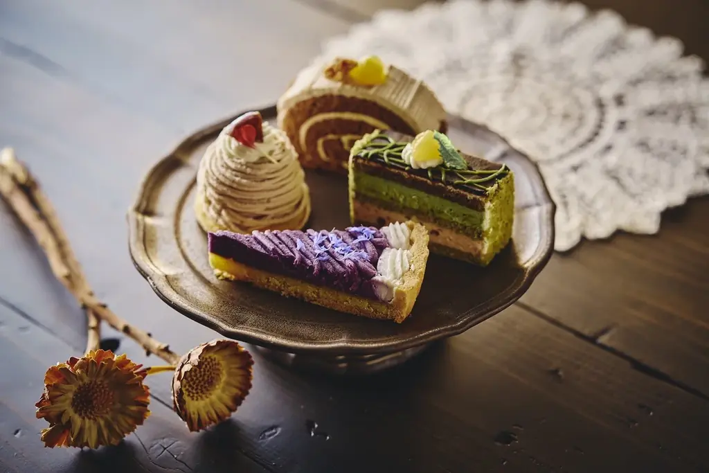 - 価格:¥850~¥1,050。内訳はマカロンのヴェリーヌ(¥1,050)、ショコラマロンロール(¥1,050)、苺のフルーツショートケーキ(¥1,050)、マスカットのバスクチーズケーキ(¥1,050)、栗のモンブラン(¥1,050)、温州みかんのプリンアラモード(¥1,050)、林檎のミルフィーユ(¥950)、ピスタチオと紫芋のタルト(¥950)、洋梨とキャラメルのズゴット(¥850)。