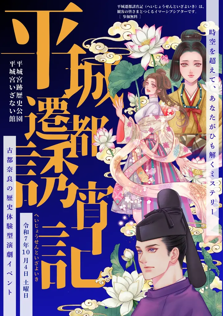 会場:平城宮跡歴史公園 平城京いざない館(奈良県奈良市)。主催は「『古都奈良の文化財』を守り伝えるプロジェクト実行委員会、企画運営は平城宮跡管理センター。令和7年度文化庁文化芸術振興補助金(地域文化財総合活用推進事業)による補助を受けます。企画制作は株式会社ノムラメディアス。