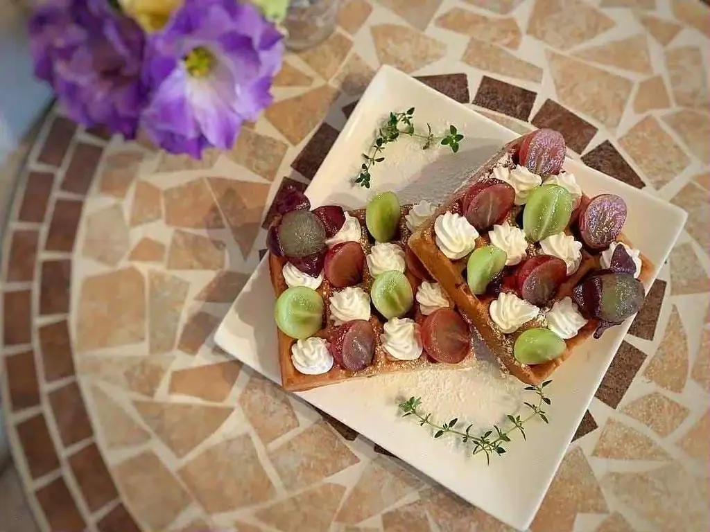 - 国産全粒粉100%ワッフル(季節の地元果物をトッピング)