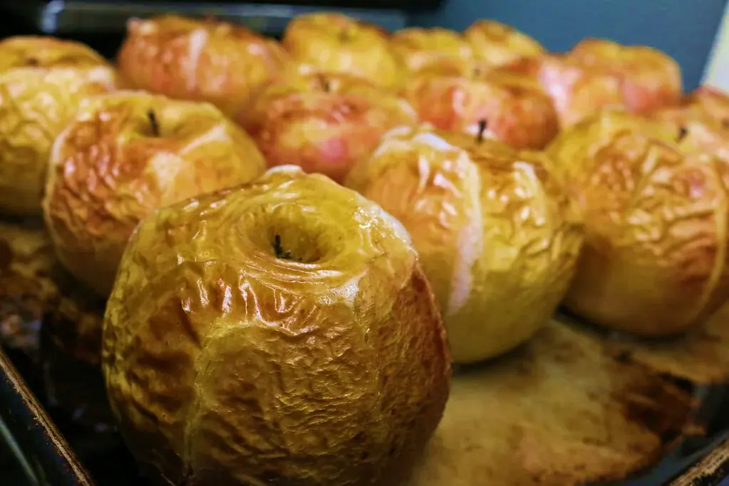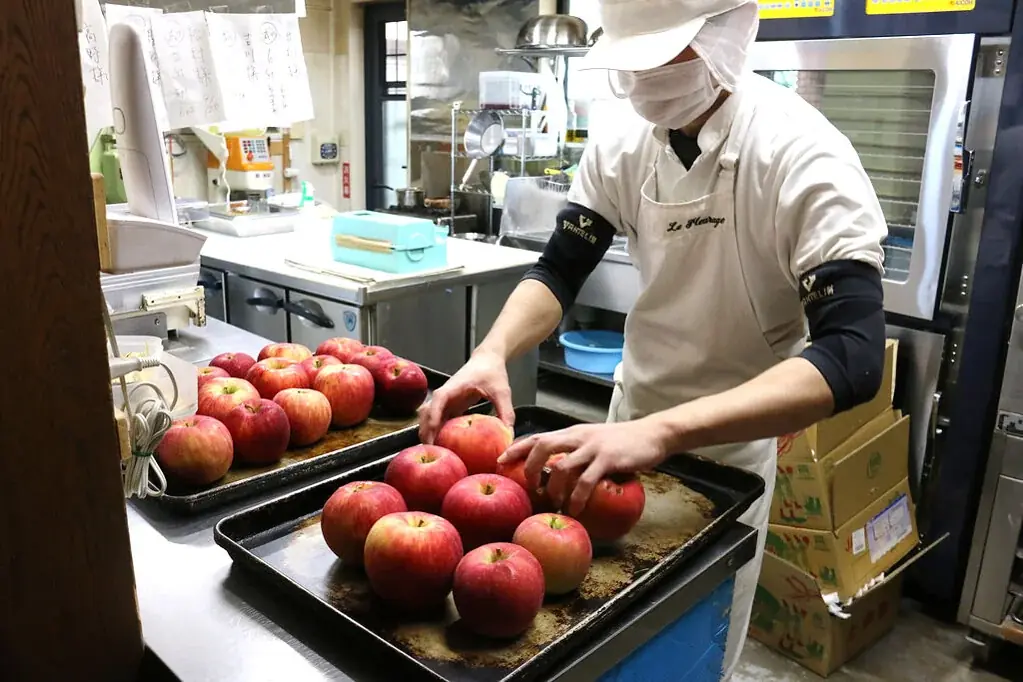 - 製パン店のオーブンで丸1日かけてリンゴを焼きリンゴに加工。