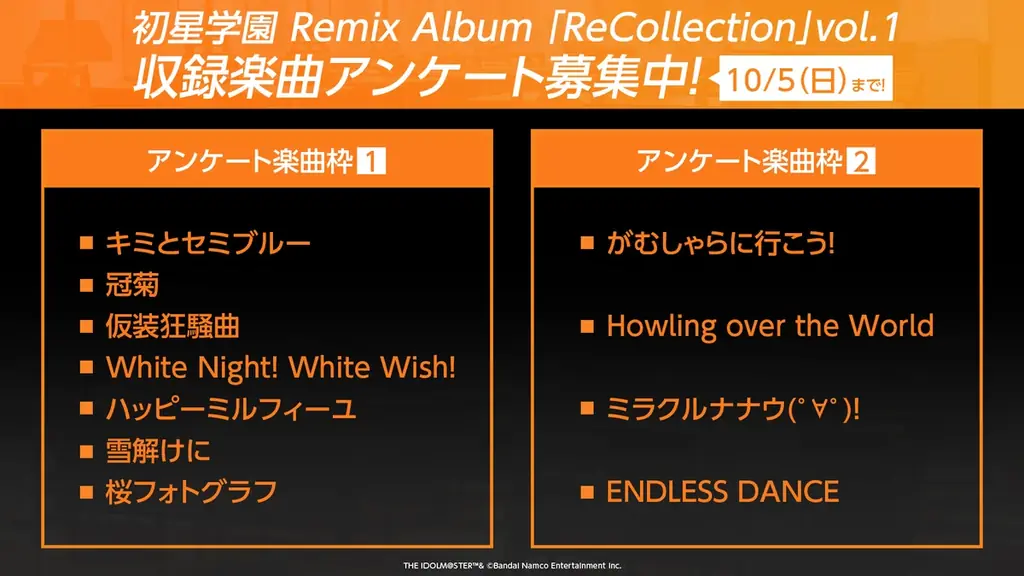 Remix Album | 初星学園 Remix Album 「ReCollection」vol.1 制作決定。収録曲はプロデューサー投票で決定。投票期限 10月5日(日) |