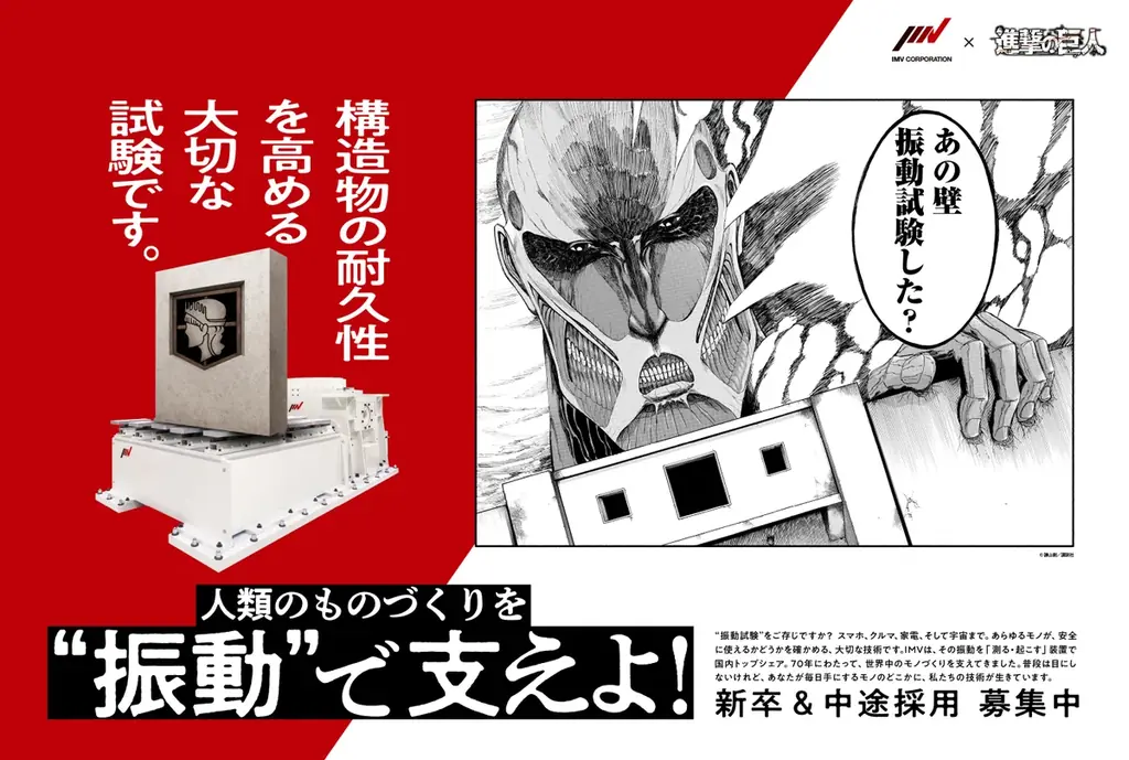 IMV株式会社は、振動を中心とした環境試験・計測・解析装置の製造・販売・試験サービスを主軸とする企業です。2025年9月22日付のリリースによれば、同社は大人気コミックス「進撃の巨人」とコラボレーションし、交通広告企画「人類のものづくりを“振動”で支えよ!キャンペーン」を2025年9月22日(月)から2025年10月31日(金)まで実施します。