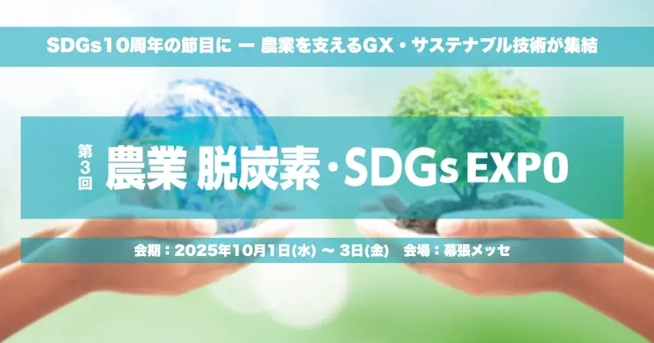 本記事では、2025年10月1日から3日に幕張メッセで開催される「第3回 農業 脱炭素・SDGs EXPO」の開催趣旨、出展される主要技術および製品、会期・会場・主催等の基本情報を整理して示しました。出展品はいずれも農業の脱炭素化や資源循環、有機栽培支援に直結する内容であり、技術導入の可能性や実運用面での示唆が得られる構成となっています。公式情報や取材・来場登録については上記のリンク先で案内が行われています。