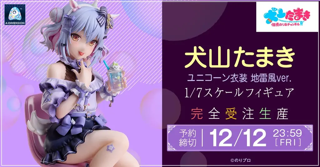 のりプロ所属の“男の娘VTuber”として人気を集める犬山たまきが、2024年の「犬山たまき生誕祭」で披露した衣装「ユニコーン衣装 地雷風」をモチーフに、1/7スケールフィギュアとして商品化されることが発表されました。本商品は株式会社A・DIMENSIONによる企画で、2025年9月22日(月)10:00より予約受付が開始され、予約期間は同年12月12日(金)23:59までとなります。