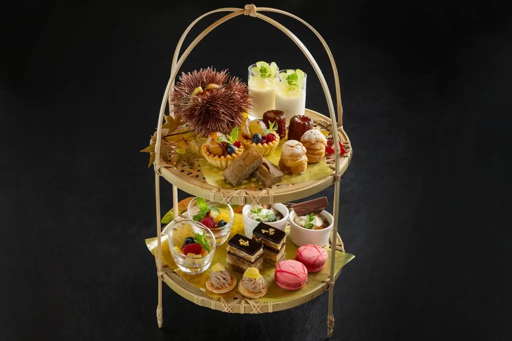 提供は開催日限定で、まずは2025年10月に実施されます。会場は敷地約820坪にわたる庭園を擁し、名庭師「七代目 小川治兵衛」による池泉廻遊式庭園を眺めながらのひとときが特徴です。竹細工職人・大江啓司(HIROSHI OE)氏が手掛けた芸術的なティースタンドが演出する見た目の美しさと、秋の旬を生かした味わいの組合せが用意されています。