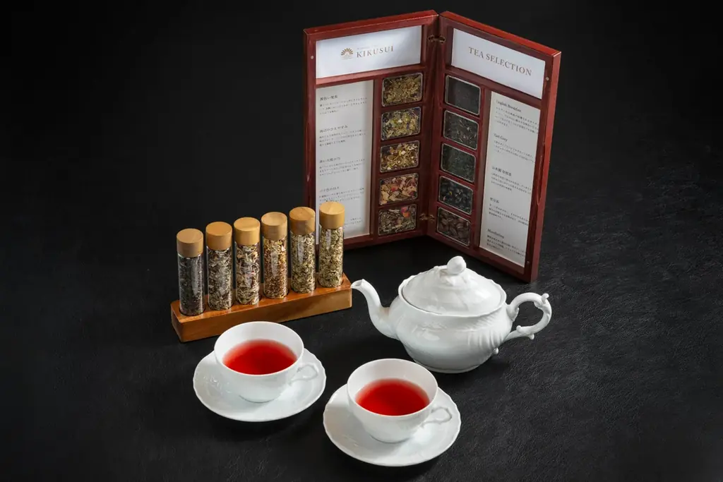 飲み物は計10種をFree Flow(フリーフロー)で提供します。コーヒーから伝統的な日本茶まで、複数の香りや味わいから自由に選べる構成です。テーブルには茶葉のサンプルBOXが用意され、ガラスケース越しに香りを確かめて選ぶことができます。