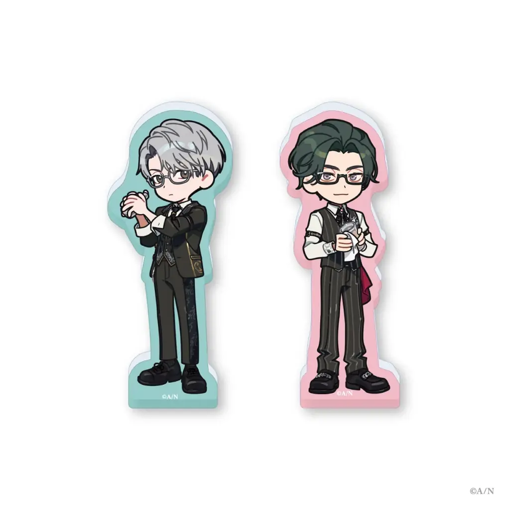- アクリルスタンド:価格 各2,000円(税込)。種類 全4種。サイズ(本体パーツ)W43mm×H150mm以内(ライバーにより差異あり)、背景パーツ W70mm×H150mm以内、台座 W68mm×H50mm以内。素材:アクリル、PET。購入制限:お1人様1会計につき各5点まで。