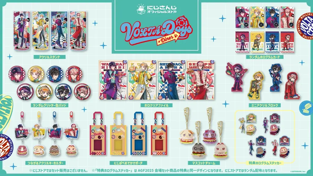 今回のラインナップは、VOLTACTIONによるダイナーをテーマとした「VOLTA Days × Diner」と、同期ユニットえりぶり(⼀橋綾人・五木左京)によるバーをテーマとした「Super Mellow Night Bar」の2種類を同時に展開する構成で、どちらもにじさんじオフィシャルストアに加え、2025年11月8日(土)・9日(日)に池袋・サンシャインシティで開催される「アニメイトガールズフェスティバル2025(AGF2025)」での先行販売が実施される。