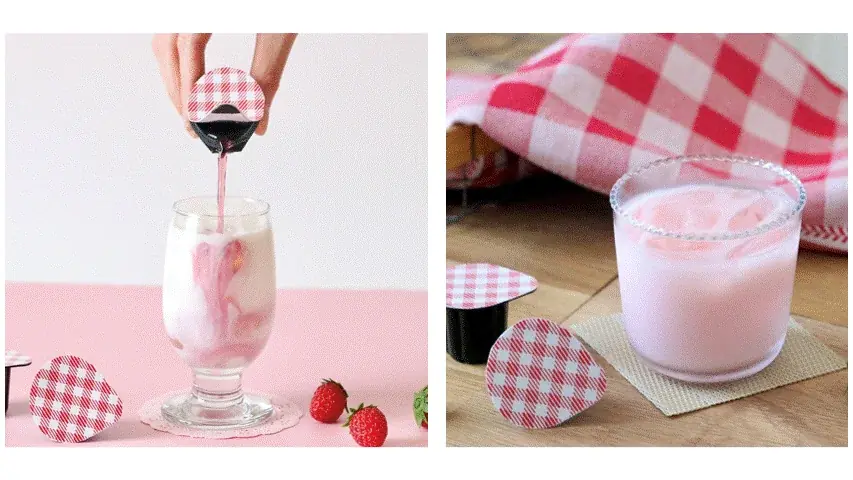 特徴 | 完熟いちご果汁使用、ポーションの液体タイプ、牛乳120ml程度と混ぜるだけ |
