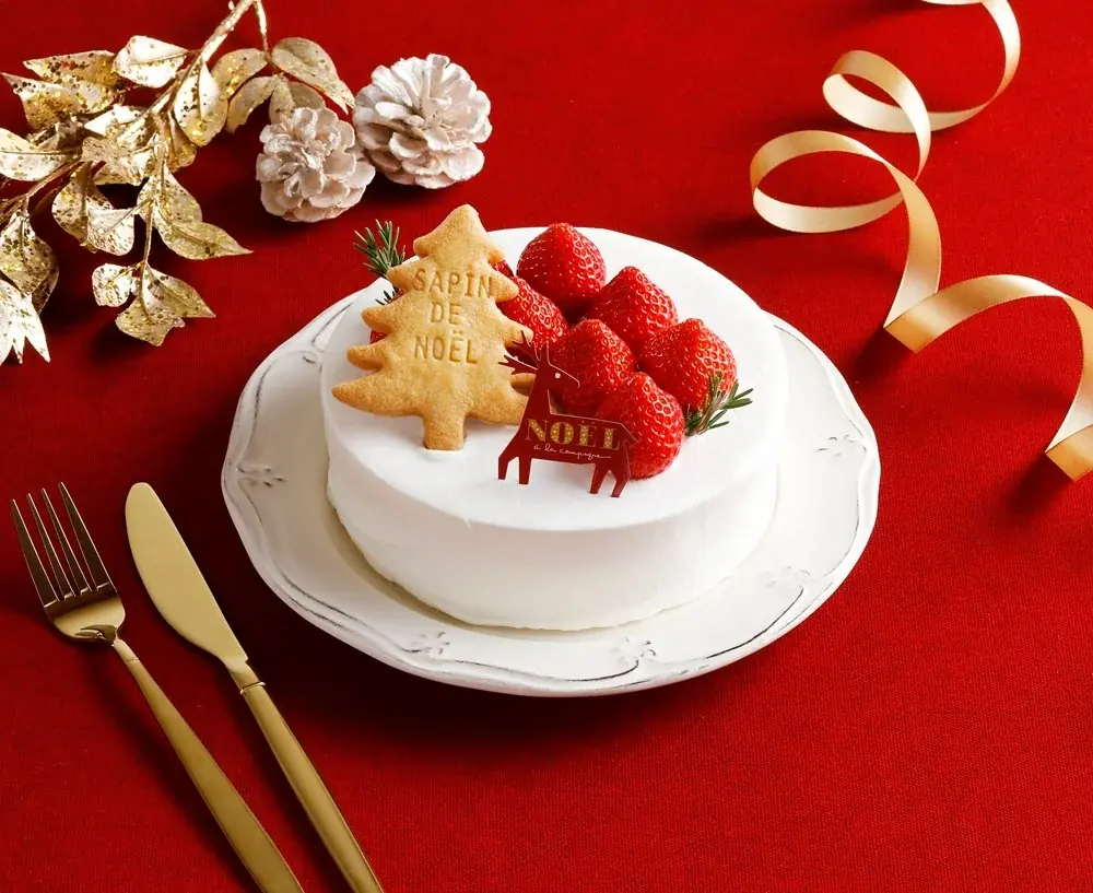 苺をサンドした定番ショートケーキ。もみの木クッキーを飾った可愛らしいデザインで、サイズは2種類が用意されています。