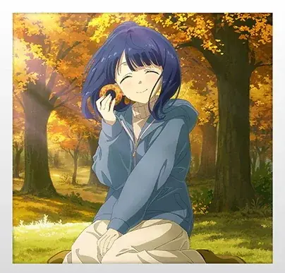 - 八奈見杏菜(食欲の秋):秋の森で陽だまりに包まれ、ドーナツを手にくつろぐ姿。幸せそうな微笑みが食欲の秋を楽しむ率直な感情を伝えます。