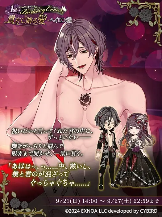 1st Birthday Event 貴方に贈る愛~ヘイロン編~ | 2025/09/21 14:00 ~ 2025/09/27 22:59 | イベント限定ストーリー(【貴方に贈る愛-ラブ-】ヘイロン等)、★4カード、限定スチル・衣装・メイク・ミニキャラ、イベント称号等 |