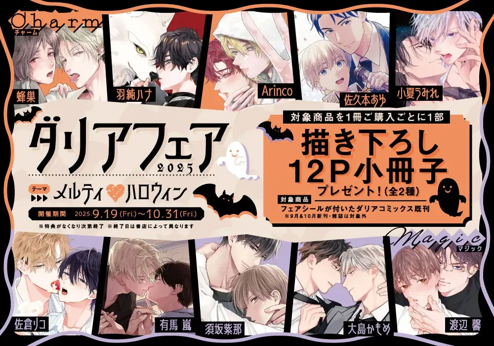 株式会社フロンティアワークス(アニメイトグループ)より、2025年9月22日 18時00分付のリリースとして「ダリアフェア2025」が発表されました。主催側によると、今年のフェアテーマはハロウィンで、総勢10名の作家による描き下ろし企画を中心に、紙書店・電子書店双方での展開や書店別の限定特典を含む複合的なフェアとのことです。
