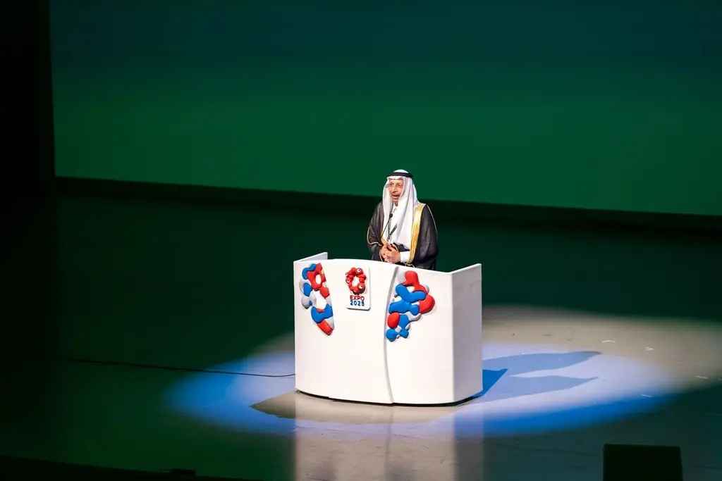 公式式典は国歌斉唱で幕を開け、続いてサウジアラビアと日本の代表による挨拶が行われました。登壇者にはサウジアラビア王国投資大臣であり同国の国際博覧会参加運営委員会の委員を務めるハーリド・ビン・アブドゥルアズィーズ・アル=ファーレフ閣下と、日本の経済産業副大臣である大串正樹氏が含まれました。