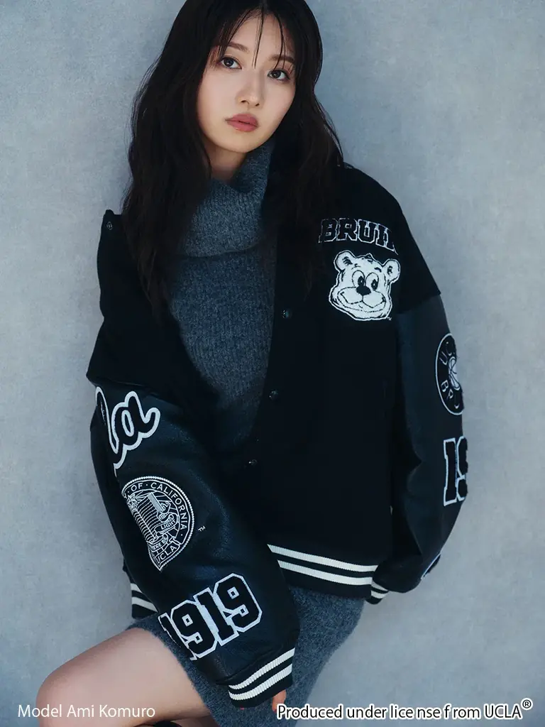 1980年代からのライセンスグッズ経験を持つNUTMEGとの別注で、UCLAをモチーフにしたスタジャン。胸元、袖、背面に配置されたUCLAのマスコット「ジョー」やUCLA専用ロゴの大ぶりなサガラ刺繍ワッペンが目を引く。